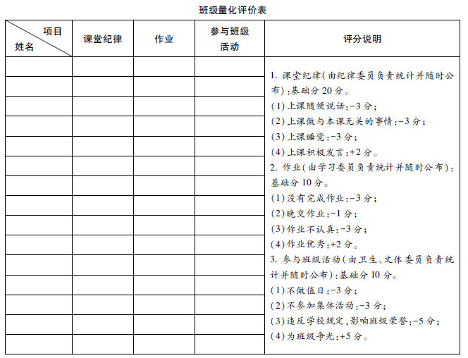 開學一個月了,有的老師反映我們班課堂紀律太差,教學內(nèi)容無法按計劃完成。為此,今天我特意走到了我們班教室的窗外,查看學生上課情況。透過窗戶,我發(fā)現(xiàn)課堂上有的學生在睡覺,有的在竊竊私語……我意識到,班里的情況并不樂觀,需要給學生立一些規(guī)矩。于是,我設(shè)計了一個班級量化評價表,作為學生日常評價的重要依據(jù),并由班委協(xié)助我進行班級管理。