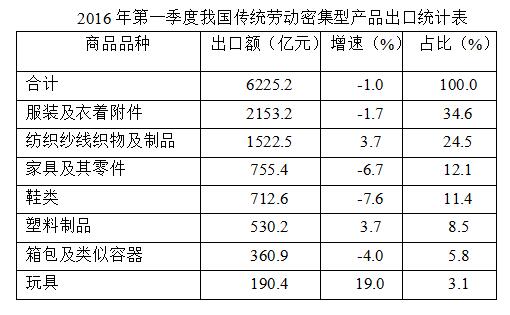 2016年一季度,我國出口紡織紗線織物及制品、服裝及衣著附件、家具及其零件、箱包及類似容器、鞋類、塑料制品、玩具等7大類傳統(tǒng)勞動(dòng)密集型產(chǎn)品(以下簡(jiǎn)稱“傳統(tǒng)勞動(dòng)密集型產(chǎn)品”)共計(jì)6225億元,比去年同期下降1%(同期全國外貿(mào)出口總值降幅為4.2%),占同期我國外貿(mào)出口總值的20.7%。