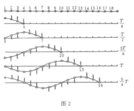 由于相鄰質(zhì)點(diǎn)間力的作用,當(dāng)介質(zhì)中某一質(zhì)點(diǎn)發(fā)生振動(dòng)時(shí),就會(huì)帶動(dòng)周圍的質(zhì)點(diǎn)振動(dòng)起來,從而使振動(dòng)向遠(yuǎn)處傳播。例如:圖2表示繩上一列波的形成過程。圖中1到18各小點(diǎn)代表繩上的一排質(zhì)點(diǎn),質(zhì)點(diǎn)間有彈力聯(lián)系著。圖中的第一行表示在開始時(shí)刻(t=0)各質(zhì)點(diǎn)的位置,這時(shí)所有質(zhì)點(diǎn)都處在平衡位置。其中第一個(gè)質(zhì)點(diǎn)受到外力作用將開始在垂直方向上做簡諧運(yùn)動(dòng),設(shè)振動(dòng)周期為T,則第二行表示經(jīng)過了T/4時(shí)各質(zhì)點(diǎn)的位置,這時(shí)質(zhì)點(diǎn)1已達(dá)到最大位移,正開始向下運(yùn)動(dòng);質(zhì)點(diǎn)2的振動(dòng)較質(zhì)點(diǎn)1落后一些,仍向上運(yùn)動(dòng);質(zhì)點(diǎn)3更落后一些,此時(shí)振動(dòng)剛傳到了質(zhì)點(diǎn)4。第三行表示經(jīng)過了T/2時(shí)各質(zhì)點(diǎn)的位置,這時(shí)質(zhì)點(diǎn)1又回到平衡位置,并繼續(xù)向下運(yùn)動(dòng),質(zhì)點(diǎn)4剛到達(dá)最大位移處,此時(shí)振動(dòng)傳到了質(zhì)點(diǎn)7。依次推論,第四、五、六行分別表示了經(jīng)過3T/4、和5T/4后的各質(zhì)點(diǎn)的位置,并分別顯示了各個(gè)對應(yīng)時(shí)刻所有質(zhì)點(diǎn)所排列成的波形。