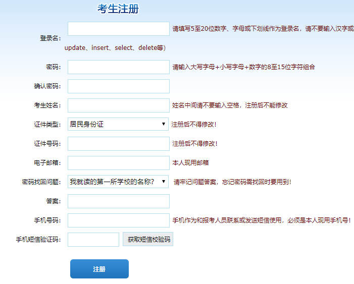 提示:報名前注冊的考生可以直接填寫登錄報名,沒有注冊的考生需要先進行注冊在登錄報名。點擊注冊按鈕,進入注冊頁面。