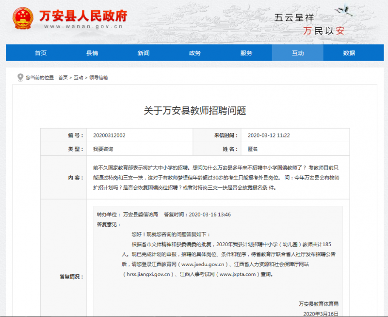 根據(jù)省市文件精神和縣委編委的批復(fù),2020年我縣計(jì)劃招聘中小學(xué)(幼兒園)教師共計(jì)185人。現(xiàn)已完成計(jì)劃的申報(bào),招聘的具體崗位、條件和程序,待省教育廳聯(lián)合省人社廳發(fā)布招聘公告后,請(qǐng)您登錄江西教育網(wǎng)(www.jxedu.gov.cn)、江西省人力資源和社會(huì)保障廳網(wǎng)站(hrss.jiangxi.gov.cn)、江西人事考試網(wǎng)(www.jxpta.com)查詢。