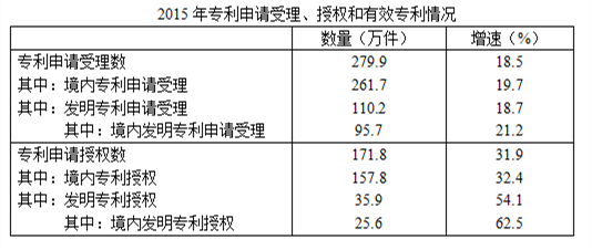 2015年,全國研究與試驗發(fā)展經(jīng)費支出14220億元,與國內(nèi)生產(chǎn)總值之比為2.1:100,其中基礎(chǔ)研究經(jīng)費671億元。截至年底,全國共擁有有效專利547.8萬件,其中境內(nèi)有效發(fā)明專利87.2萬件,每萬人口境內(nèi)有效發(fā)明專利擁有量6.3件。
