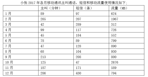 92、小張2017年主叫通話、短信和移動流量均使用了套餐外服務(wù)的月份有幾個?
